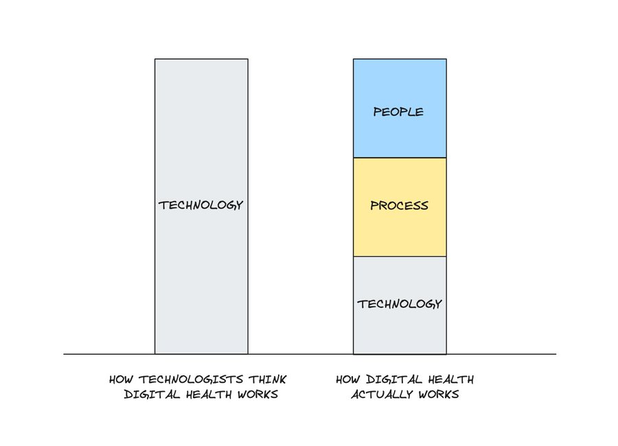Joshua wrote, “Let me show you … why studies evaluating the same tech can have very different outcomes. Why the very same tech implemented with different workflows and people can lead to wildly different results.” See the great (and pretty funny, actually) visual that Joshua Liu made about this, but the point is this: Technology is not a thing unto itself. It is not a magic pill like those gelatin caps that you can buy at toy stores and when you toss them in the bathtub, they expand into surprisingly large foam dinosaurs. I mean, you can buy any given healthcare, digital technology, anything … and what doesn’t pop out of the box along with purchase are any sort of “why” for an end user to actually use the thing, or implementation plans, processes, change management, empowered people who are bought in, adequate training, adequate staffing levels, and ongoing communication.