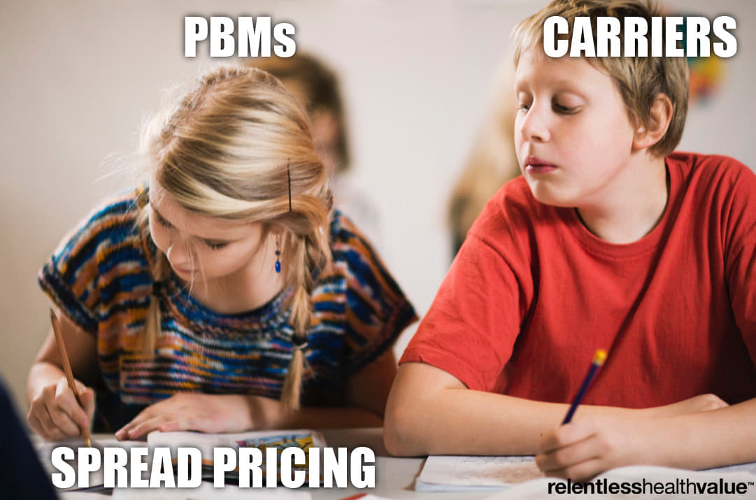 I’m putting a meme in the show notes. It’s my second meme ever, so I’m clearly on a roll. As you can see, it’s a picture of two kids taking a test; and the one kid is cheating off the other kid. It’s a How to Do Spread Pricing test, and the kid with carrier has his eyes all over the PBM kid’s test.